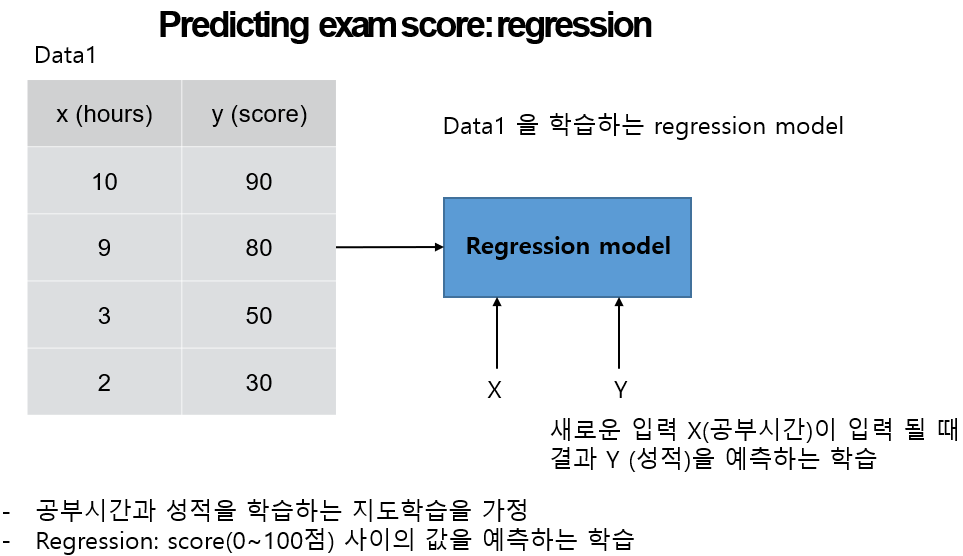 공부한 시간 x(hour) 만큼 공부한 학생들이 점수 y(score) 의 성적을 받는다. 이 데이터가 학습 데이터가 되어 regression 모델에 입력으로 사용된다. 이제 새로운 데이터가 들어온다. 7시간 공부한 학생이 있는데 과연 점수는 몇 점을 받을까? 학습 데이터를 사용하여 학습이 완료된 regression 모델이 입력 7(x)을 받아 점수 y를 예측한다.