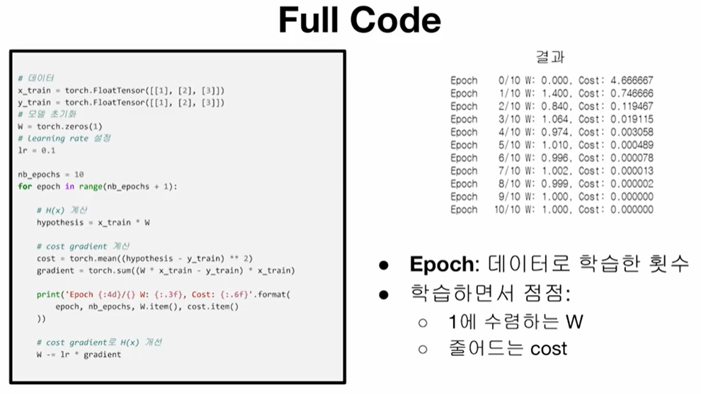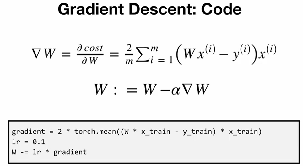 print("Epoch {:4d}/{} W: {:.3f}, Cost: {:.6f}".format(epoch, nb_epochs, W.item(), cost.item()))