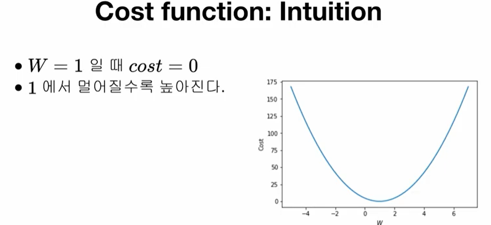 cost function은 모델의 예측 값이 실제 데이터와 얼마나 다른지를 나타내는 값으로, 잘 학습된 모델일수록 낮은 cost를 갖는다. 위 모델에서는 W=1 일 때, cost=0이며, W가 1에서 멀어질수록 cost가 높아진다.