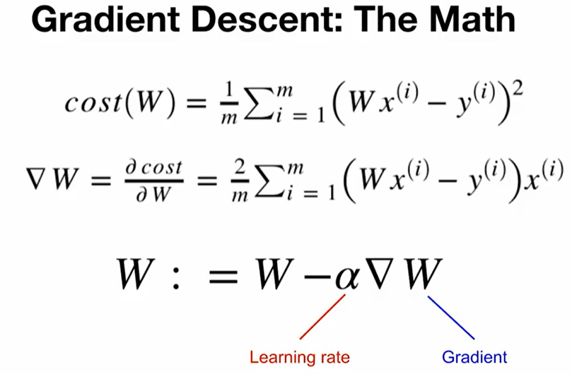cost function이 예측값과 실제값의 차이를 나타내므로, 학습의 목적은 cost function을 최소화 하는 것이다. cost를 최소화하기 위해서는 기울기가 음수일 때는 W가 더 커져야 하고 기울기가 양수일 때는 W가 더 작아져야 한다.