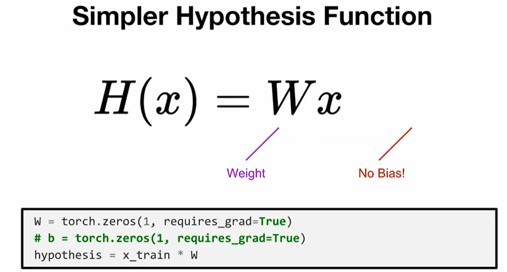 이 데이터는 입력과 출력이 동일하므로 W = 1이 가장 좋은 값이 된다.( H(x) = x가 가장 정확한 모델 )