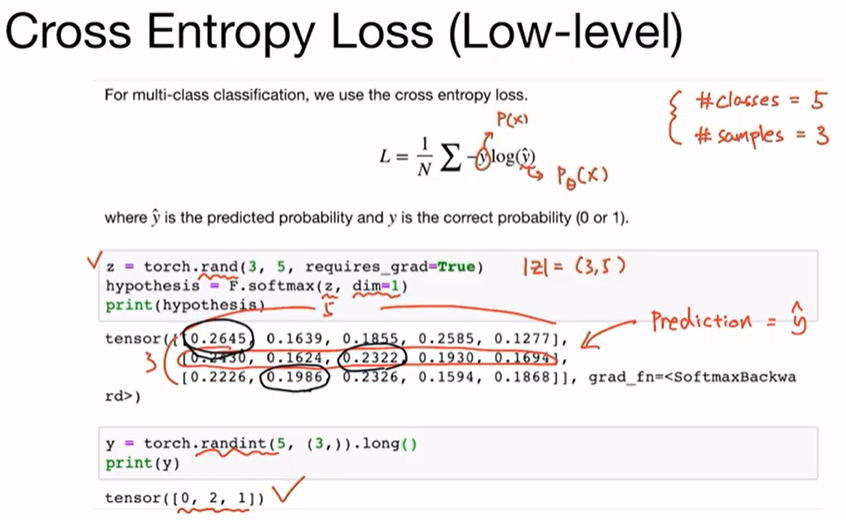 Cross Entropy Loss는 위의 수식과 같이 나타낼 수 있다. y는 실제 정답 y이며 P(x)에 해당한다. ^y는 Q(x)이며 어떤 PΘ(x)와 같이 표현할 수 도 있다. torch.rand() 함수를 사용하여 (3, 5) 사이즈의 텐서 z를 생성한다. 그리고 이것은 required_grad=True를 통해 그래디언트 학습이 가능하다. 다음으로 z에 대해 F.softmax() 함수를 수행하고 dim=1을 통해 두 번째 차원(5)에 대해 softmax를 수행한다. 위 예는 랜덤 한 값을 사용한 실습이기 때문에 정해진 정답은 없지만, 코드를 살펴보면 5개의 class를 갖고 3개의 sample을 갖는다.