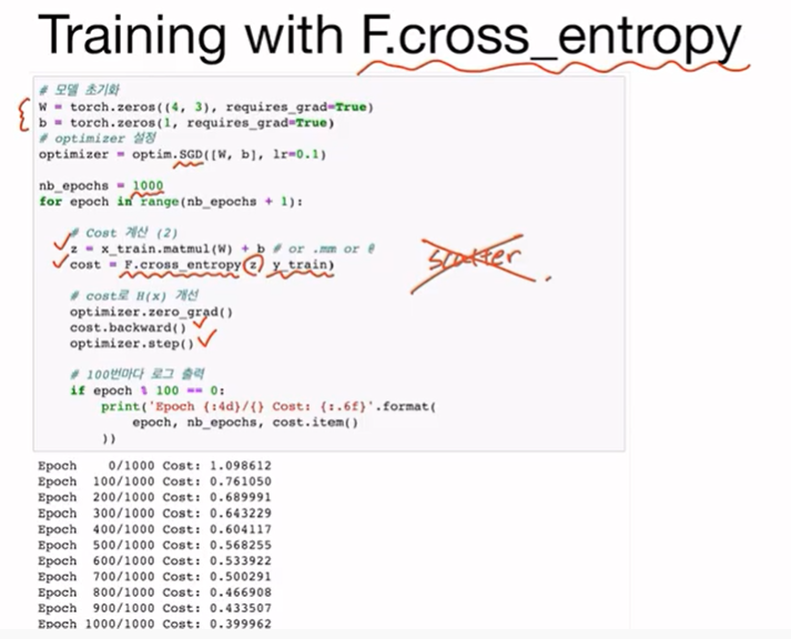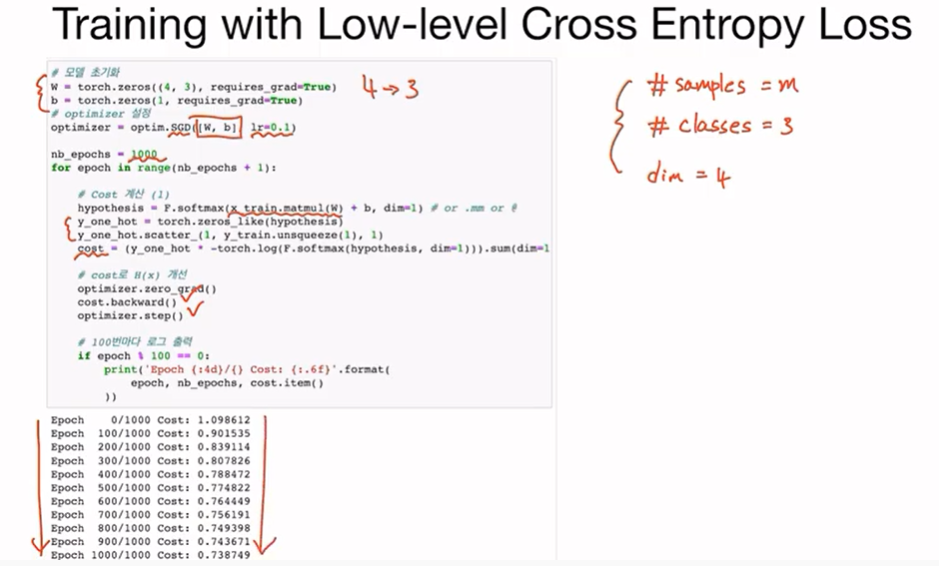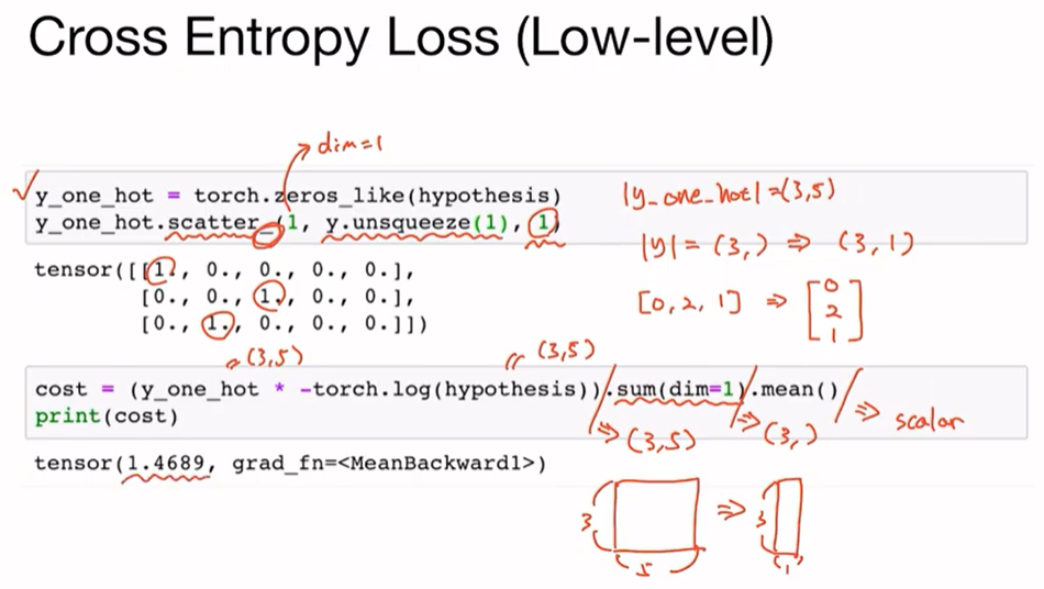 cost = (y_one_hot * -torch.log(F.softmax(hypothesis, dim=1))).sum(dim=1).mean()