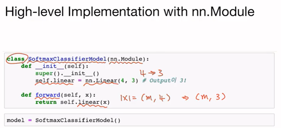 이것을 더 쉽게 실전에 가깝게 구현할 수 있다. nn.Module을 상속받아 SoftmaxClassifierModel() 클래스를 정의하여 사용할 수 있다.