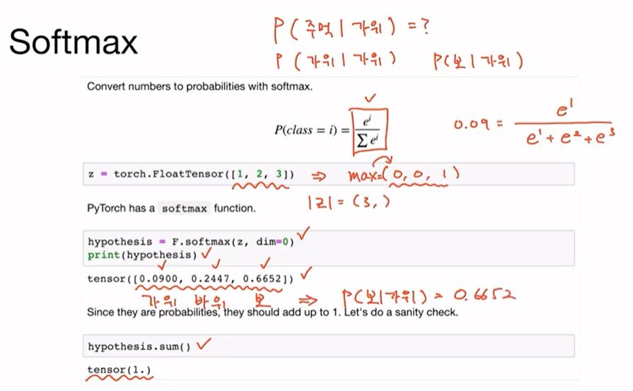 그래서 우리는 이산적인 확률 분포를 바탕으로 neural network 또는 machine learning을 수행하게 되는데, 예를 들어 가위바위보에서 상대방이 다음에 낼 것을 예측하는 머신러닝 프로그램을 짠다고 가정한다. 이전의 상대방이 낸 것을 바탕으로 다음에 상대방이 낼 것을 예측할 수 있을 것이다(완전히 랜덤이 아니라 사람마다 일정한 패턴이 있을 것이라 가정). 주어진 값에 대해 argmax( )의 결과 값은 (0, 0, 1)이 될 것이다. 하지만 softmax는 합쳐서 1이 되는 일종의 확률 값과 같이 나타내 준다.