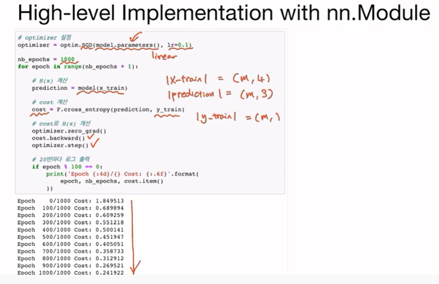 모델은 두 개의 학습 파라미터 W와 b를 갖는다. 샘플의 개수는 m, 클래스의 개수는 3, 차원의 개수는 4이므로 4->3으로 가는 Linear Layer를 만든다(W= torch.zeros((4, 3), requires_grad=True). 실행 결과를 보면 cost가 점차 줄어들며 학습이 잘 되는 것을 확인할 수 있다.