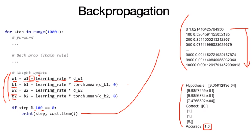 업데이트는 간단하게 이루어진다. 기존의 w에 backpropagation을 통해 얻은 미분 값을 learning_rate에 곱해서 빼주면 업데이트가 이루어진다. 이 경우는 gradient descent에 해당하며(minimize), gradient ascent를 할 경우에는 더해주면 된다. 학습이 진행되는 과정을 출력해보면 loss가 점점 줄어들며 학습이 진행되는 것을 확인할 수 있다. 학습 후 모델의 출력을 보면 분류를 잘 해내고 정확도도 100%에 도달하는 것을 볼 수 있다. 즉, Backpropagation과 Multi Layer Perceptron으로 XOR 문제를 해결할 수 있는 것을 볼 수 있다. PyTorch에서는 앞의 Backpropagation 과정을 backward() 함수를 통해 간단하게 적용할 수 있다.