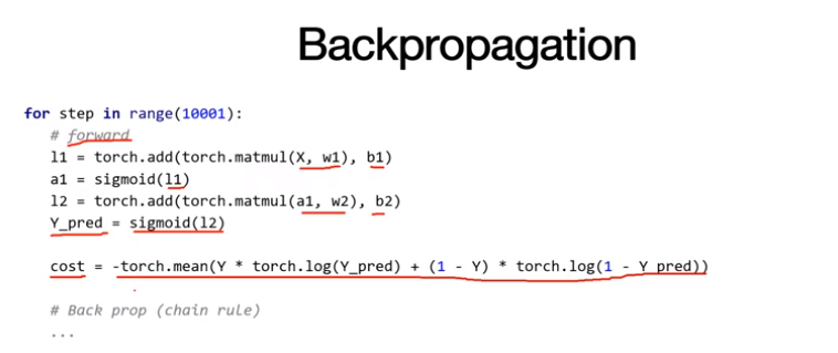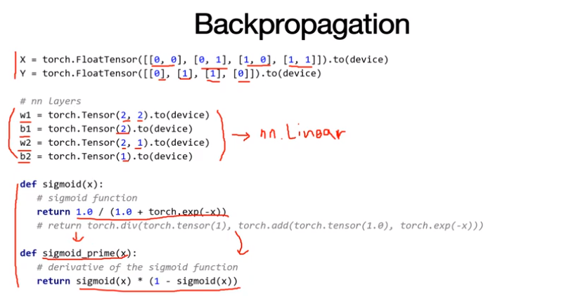 Backpropagation을 code를 통해서 살펴본다. Layer를 선언하는데, w와 b를 직접 일일이 선언한다. 두 개의 레이어가 선언되는데 이는 nn.Linear 두 개를 선언한 것과 같은 것이다. sigmoid 또한 라이브러리를 사용하지 않고 직접 구현해서 사용한다.