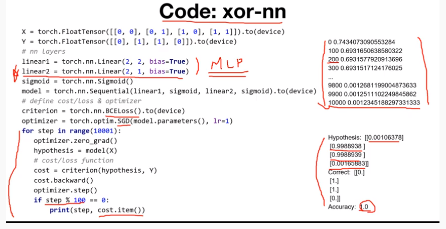 PyTorch에 조금 더 맞춰진 코드를 살펴본다. 이전에 살펴본 코드들과 별다른 차이는 없지만 하나 Linear layer가 추가된다. 즉, 두 개의 layer를 선언하여 사용한다. 결과를 살펴보면 학습이 진행될수록 loss가 계속 줄어들고 학습이 잘되어 100%의 정확도를 달성해 XOR문제를 해결하는 것을 볼 수 있다.