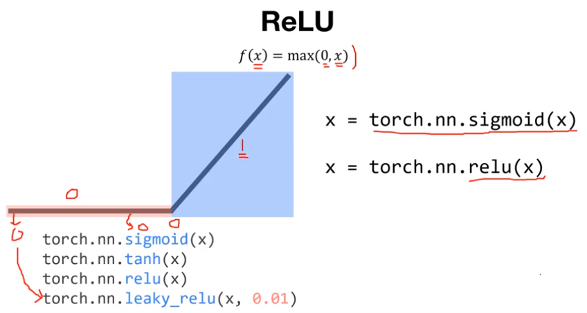 ReLU 함수는 입력 값이 음수인 경우 0으로 출력하며, 0보다 큰 값은 자기 자신을 출력한다. 즉, 음수가 입력되면 gradient가 0이 되고 양수가 입력되면 gradient가 1이 된다. 굉장히 간단하지만 효과가 좋으며 파란색 영역에서 gradient를 계산하면 1이기 때문에 vanishing gradient 문제가 발생하지 않는다. 다만, ReLU는 음수의 입력에 대해서는 gradient가 0 이기 때문에 gradient가 사라지는 문제가 발생하기도 하지만 잘 작동되는 편이다. PyTorch에서는 torch.nn.relu() 함수를 사용하여 ReLU activation function을 사용할 수 있다. 그 외에도 PyTorch는 다양한 activation function을 제공한다.