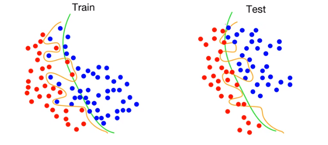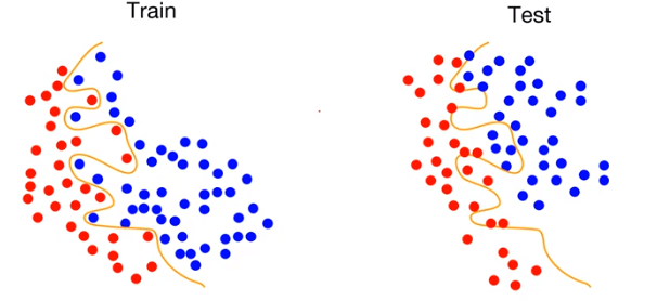 예를 위와 같이 classification 문제로 바꿔보자. 주어진 데이터는 빨간색과 파란색으로 구성되어있고 이들을 분류하는 문제이다. train set을 기준으로 overfitting 되도록 학습을 진행했다고 가정하자. overfitting 된 분류기는 빨간색과 파란색을 완벽하게 분류하도록 학습되었다. 즉, train 도중 이 classifier는 acc가 100%에 도달했다는 의미이다. 이렇게 학습된 모델을 test set에 적용해본다. 그림의 우측과 같이 성능이 그리 좋지 못하다. 이와 같은 결과가 나타나는 이유는 train set과 test set이 완벽하게 일치하지 않기 때문이다. train set에는 굉장히 잘 훈련됐지만, 실제 test set에 적용할 때는 한 번도 보지 못한 데이터들이 들어오기 때문에 overfitting 된 모델은 에러율을 증가시킬 수 있다.