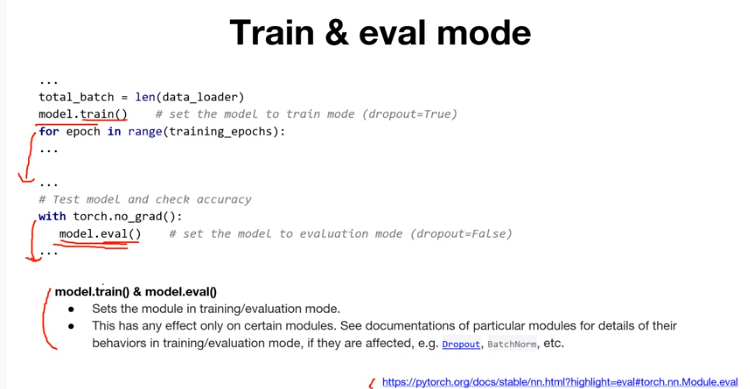 dropout을 사용할 때 한 가지 주의할 것이 있는데, dropout은 학습을 진행하면서 node를 사용할 것과 사용하지 않을 것을 무작위로 선별하는 것인데, 이것은 학습할 때의 방식이며 test를 할 때는 모든 node를 사용해야 한다. 그렇기 때문에 dropout을 사용할 때는 train() 모드와 eval() 모드를 주의해서 사용해야 한다. model.train() 선언 시 설정한 dropout을 적용하게 되고, model.eval() 선언 시 모델에 있는 dropout을 적용하지 않게 된다.