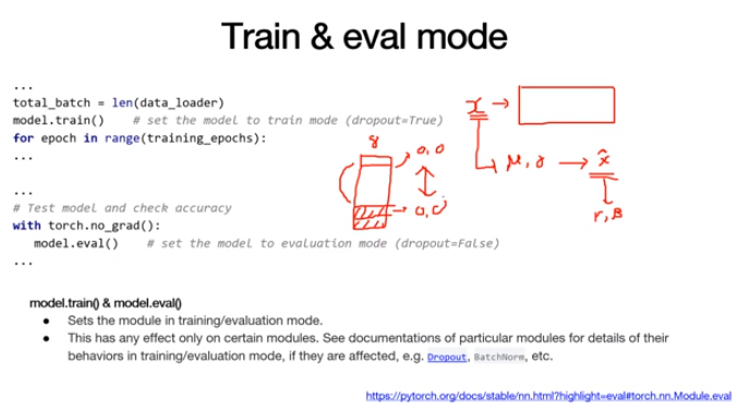 앞서 dropout에 관해 살펴볼때 평가시에는 model.eval() 사용후 평가해야한다고 했다. BatchNorm을 사용하기 위해서도 마찬가지 이다.
